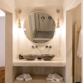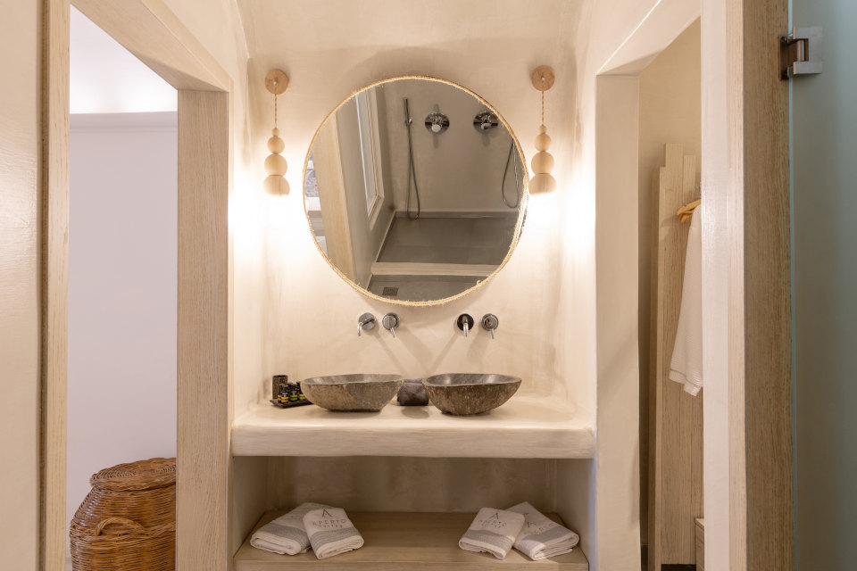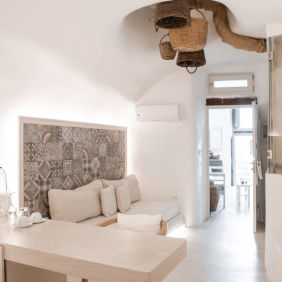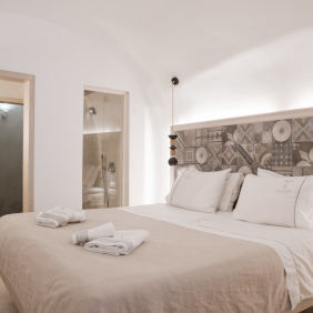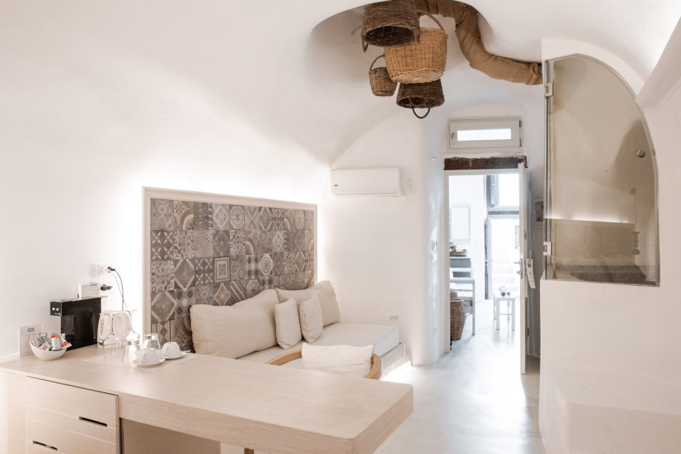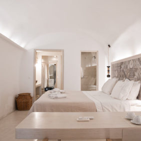 The suite opens onto a shared balcony with another room, overlooking the caldera, the volcano, and Santorini’s iconic sunset—an inspiring setting to unwind and take in the island’s beauty.