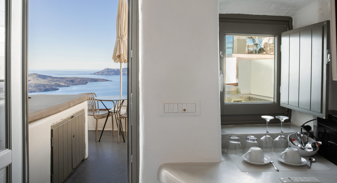 Totally private with amazing sea views of the caldera, this suite is ideal for couples with a king size double bed and a sitting area. The balcony is private.